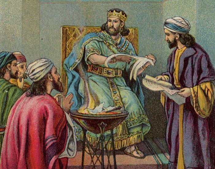 23 And it came to pass, that when Jehudi had read three or four leaves, he cut it with the penknife, and cast it into the fire that was on the hearth, until all the roll was consumed in the fire that was on the hearth.