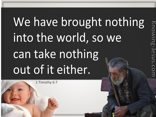 π 1 Timothy 6:6-10 But godliness with contentment is great gain. For we brought nothing into this world, and it is certain we can carry nothing out. And having food and raiment let us be therewith content. But they that will be rich fall into temptation and a snare, and into many foolish and hurtful lusts, which drown men in destruction and perdition. For the love of money is the root of all evil: which while some coveted after, they have erred from the faith, and pierced themselves through with many sorrows.Β