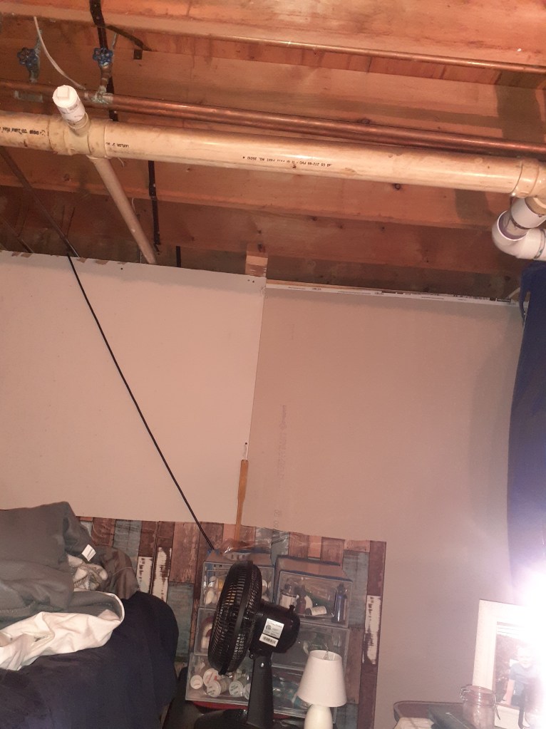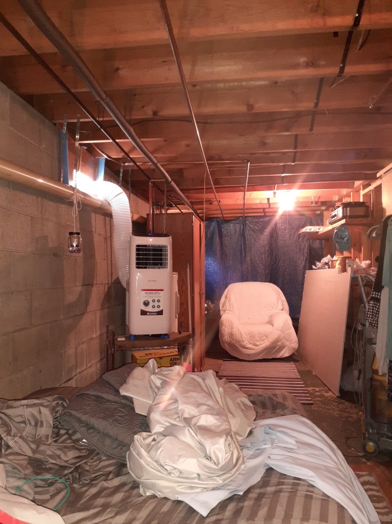 I have went throughout the basement with the vacuum sucking all the spiderwebs down, used the dehumidifier to remove excess moisture from the air, sprayed homemade lavender spray, placed moth balls around, put up tarps to block the water softener, and the bladder, been keeping lights on so it will be well lit, then bought a portable air conditioner/dehumidifier. I actually hung up a couple of pieces of drywall up and put wall paper on it to make it a bit more homey. I threaded an extension cord over the wall for power on this side, because there is no outlets. I put a tarp over some large pipes that were over my bed and I have settled in very happy with the blessing from God.
