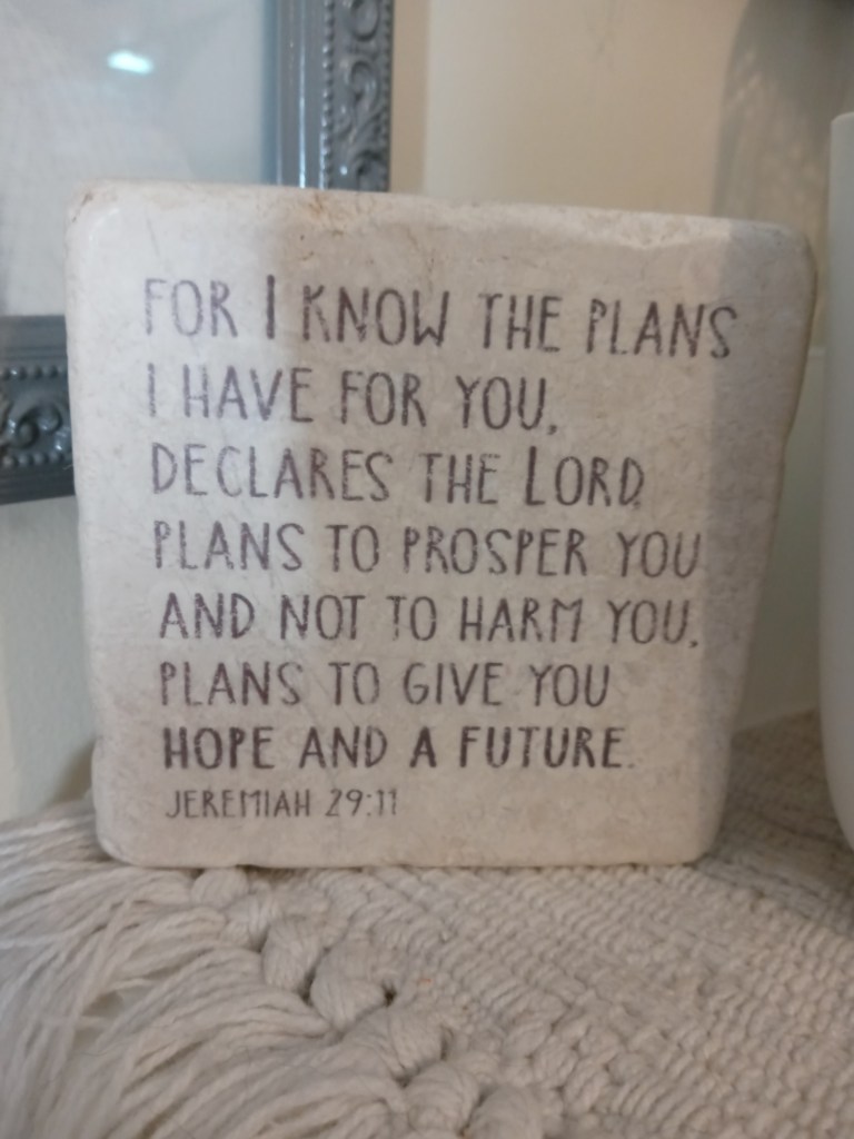 Psalm 91 and Psalm 27 over you all -His Word will NOT return void -His Will and PLAN for you be accomplished in Jesus name -He loves you with an everlasting love and His everlasting arms are the ones you are in – you are inscribed in His Hand- His mighty Arm goes BEFORE you -His Will, His WAY – Your Faith -Jeremiah 29:11 For I know the thoughts that I think toward you, saith the LORD, thoughts of peace, and not of evil, to give you an expected end.-