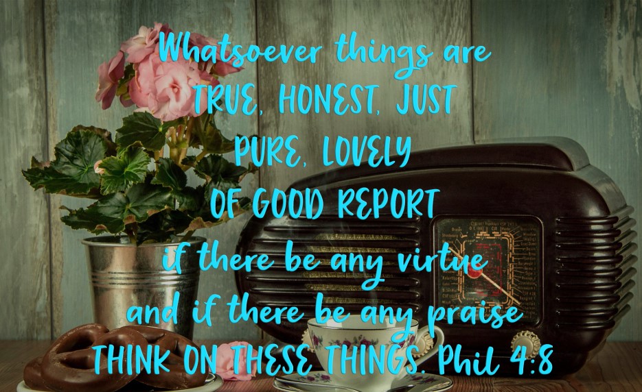 ππ Philippians 4:8 says this; ” Finally, brothers, whatever is true, whatever is noble, whatever is right, whatever is pure, whatever is lovely, whatever is admirable-if anything is excellent or praiseworthy-think about such things. “