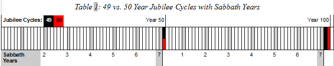 This confusing passage leaves you wondering if the cycle spoken of is 49 or 50 years long. Most people understand it to mean 50, but this view actually breaks Scripture: the requirement that Jubilees follow every seventh Sabbath year. A Jubilee cycle of 50 years falls out of sync with the Sabbath year cycle since 50 is not a multiple of seven. It falls at the right place for the first Jubilee but with each subsequent Jubilee cycle it drifts a year later each time. Only a Jubilee on a 49-year cycle stays in sync (7 x 7 = 49). In the chart below you can see the Sabbath years in gray and directly after each 7th Sabbath year black marks for the correct 49-year Jubilees. The supposed 50-year Jubilee in red can be found at the 50 and 100 year marks. The first one coincides with the 49-year Jubilee but notice the gap between the second 50-year Jubilee (at the 100 year mark) and the 7th Sabbath year. That gap breaks Scripture.